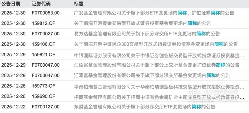 12月30日,易方达基金发布公告,宣布变更旗下45只ETF简称,相关调整将于2026年1月5日生效。此次调整后,易方达成为行业首家完成旗下全部ETF简称调整的基金公司,全部117只ETF简称均按照“投资标的核心要素+ETF+管理人名称”标准格式统一命名。