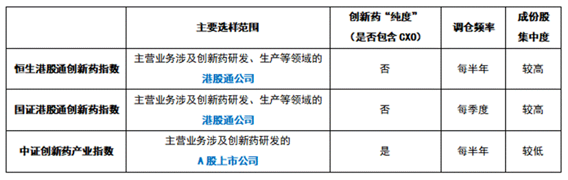 接下来,我们就对比创新药板块三条主要指数的差异: 恒生港股通创新药指数、国证港股通创新药指数与中证创新药产业指数 。