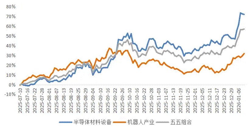 目前,这两大领域均有“纯度”较高的指数可供布局。例如,截至2026年1月9日,中证半导体材料设备主题指数半导体权重超92%,龙头集中;国证机器人产业指数中人形机器人相关个股权重占比达到77%,年内表现突出。将两者结合,在2025年7月10日至2026年1月9日的模拟回溯中,五五组合累计收益约57%,在平衡波动的同时实现了不错回报。