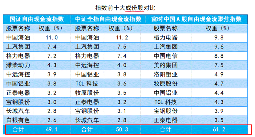 国证和中证的成份股都是100只,而富时的成份股只有50只,重仓股的涨跌对其的影响更大一些。这也解释了为什么下表中富时前十大成份股占比最高,超60%,其他两个都是50%左右。