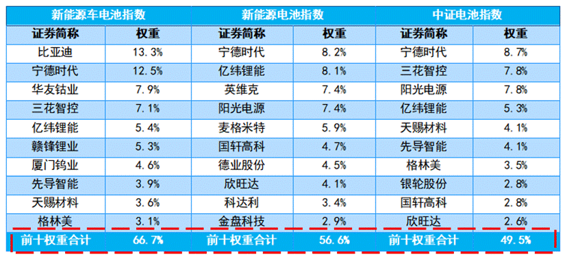 这也解释了为什么在上面的表格中,新能源车电池指数的前十大集中度最高,为66.7%,而中证电池指数由于覆盖行业最为广泛,前十大集中度只有49.5%。