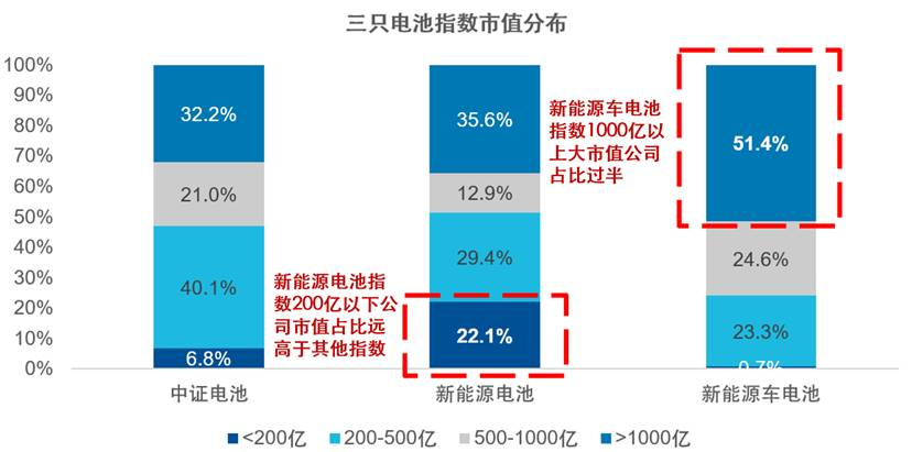 而中证电池指数由于覆盖全产业链,大中盘个股均有涉及,成份股市值分布相对更均衡分散。